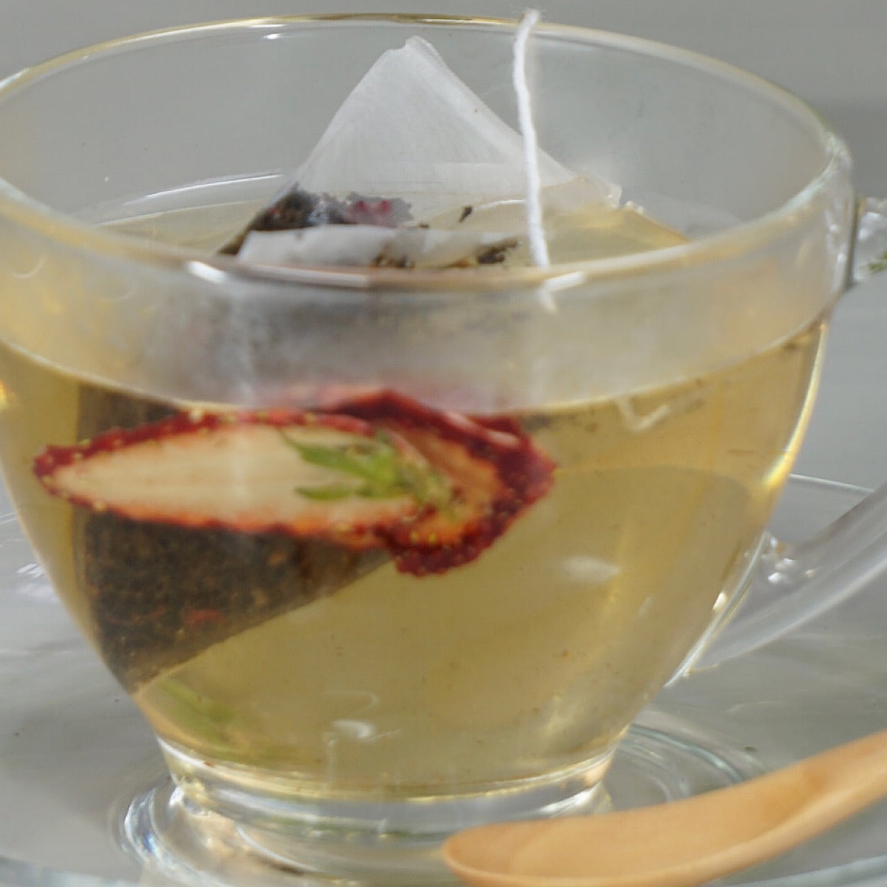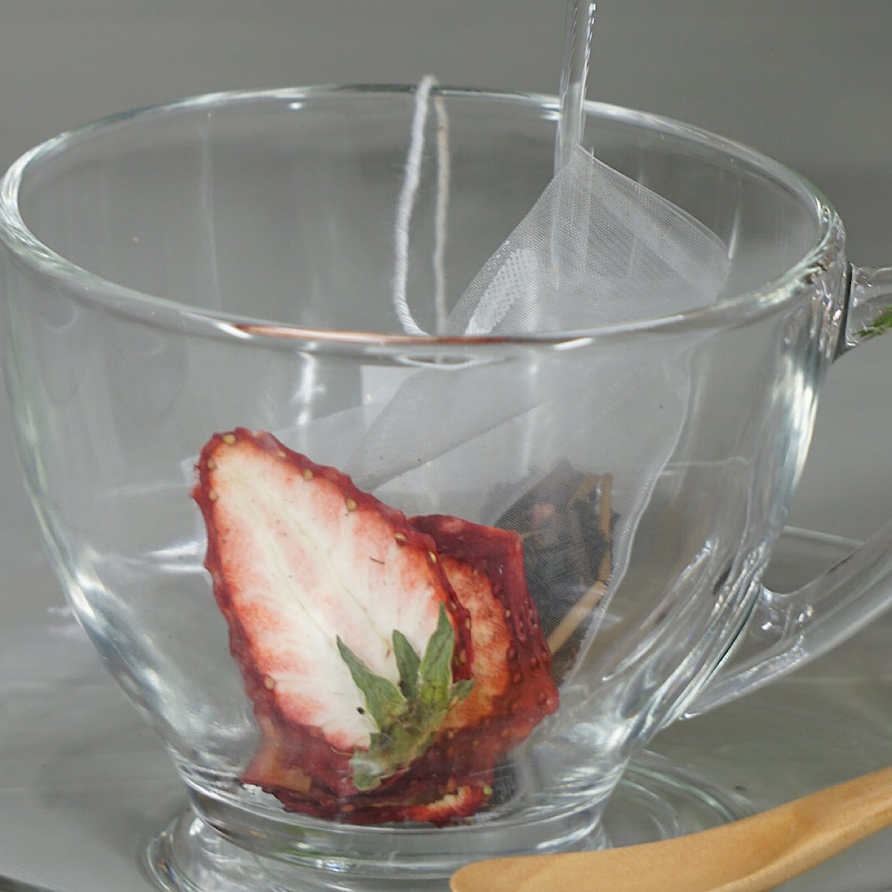 ティーカップにティーバッグとドライイチゴをのせ、沸騰したお湯を注ぎます。